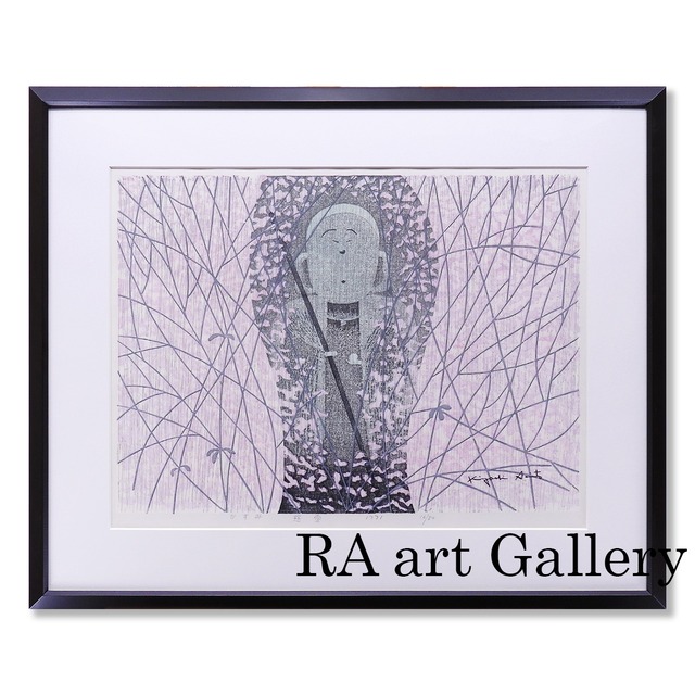 ■作品解説:1907年福島県出身。90歳没。独学で木版画の学び、福島県会津の風景や京都奈良の寺、仏画などを多く作製。2018年渋谷ヒカリエにて展覧会開催。 素朴な構成でありながら黒灰色を基調とした作品は味わい深く、洋画技法を習得した事により遠近法を作品に取り入れる事によって他の木版画には出せない世界を作りだしている。 本作品「かすみ慈愛」(1991)は、1940年代から取り組んだ古仏の主題「慈愛」というシリーズの主題を、花のモチーフと重ねて再構成した晩年の完成作。 斎藤清美術館でも本作を晩年の意欲作として紹介。 鮮やかなピンクのかすみ草の中に地蔵を配した作品として言及。ピンクは装飾ではなく、微粒子の層として画面全体に漂い、タイトルの「かすみ」を視覚化している。 斎藤清の傑作と言っても過言ではない作品。 ■作家名:斎藤清 ■作品名:かすみ慈愛 ■技法・ED:木版画 雲母刷り 限定80部 ■サイン:作家直筆サイン ■作品サイズ:縦47cm×横62cm(窓寸) ■作品状態:良好 ■額サイズ:縦68.5cm×横83.4cm ■額状態:新品 ■付属品・備考:箱、黄袋/制作年:1991年 レゾネ:大塚巧藝社No.225 ■発送場所/梱包配送費:元払い ・商品状態は極力記載しておりますが、見落としがある場合もございます。中古品としてご理解ください。 ・箱や額は作品の付帯品とお考え下さい。箱や額のコンディション等によるクレームは一切お受けできません。 ・新品・新品同様の商品に関しましては、新品の記載をさせていただいております。 ・真作保証につきまして、タイトル又は商品説明に真作保証の記載がある商品を対象とします。 万が一贋作と判断された場合は返金致します。※返金詳細はお問い合わせください。 ・別途費用をいただきますが、鑑定の代行や写真または現物品での簡易鑑定も承ります。※当出品商品以外でも可能です。 ・店頭や他サイトと併売しておりますため、予告なく取り消す場合がございます。 ・同梱値引き・現物確認・ご質問などお気軽にお問い合わせください。 ・新品額装・軸装への交換、作品の修復、箱などの付属品の作成、大型作品の配達・取り付け、照明などの展示環境の工事(リフォーム)なども承ります。