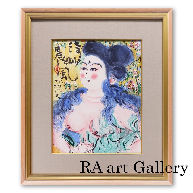 ■作品解説:1903年青森県出身。72歳没。木版画として世界最高峰の評価を得ている巨匠。 作家は板画と呼んでいる。板画作品の他には、油彩や倭絵(紙本彩色)などもある。 本作品は、東急百貨店が企画、財団法人棟方板画館が監修し1996年に作られた正規品の版画。 作品に描かれている清妙晨風は、「清らかで、繊細に美しい夜明けの風」という意味。 右側の背景に描かれている朝顔の花から、夏の爽やかさを棟方の得意とした妃図とともに表現されている。 原画は1966年に描かれた倭絵。 2026年現在から丁度60年前の丙午(ひのえうま)に描かれた作品で出生数の激減など様々な事が話題となった年の作品。 この時代背景と作品に描かれている書と作品を見る事で、様々な事が読み取れるので是非1966年に他に何があったか是非調べて作品を観て頂きたい。 ■作家名:棟方志功 ■作品名:清妙妃図 ■技法・ED:木版、リトグラフ併用/限定240部 ■サイン:版上落款、印 ■作品サイズ:縦42.4cm×横33.3cm ■作品状態:良好 ■額サイズ:縦64.5cm×横55.4cm ■額状態:良好 ■付属品・備考:箱、タトウ箱、黄袋、証明書(棟方板画館) ■発送場所/梱包配送費:元払い ・商品状態は極力記載しておりますが、見落としがある場合もございます。中古品としてご理解ください。 ・箱や額は作品の付帯品とお考え下さい。箱や額のコンディション等によるクレームは一切お受けできません。 ・新品・新品同様の商品に関しましては、新品の記載をさせていただいております。 ・真作保証につきまして、タイトル又は商品説明に真作保証の記載がある商品を対象とします。 万が一贋作と判断された場合は返金致します。※返金詳細はお問い合わせください。 ・別途費用をいただきますが、鑑定の代行や写真または現物品での簡易鑑定も承ります。※当出品商品以外でも可能です。 ・店頭や他サイトと併売しておりますため、予告なく取り消す場合がございます。 ・同梱値引き・現物確認・ご質問などお気軽にお問い合わせください。 ・新品額装・軸装への交換、作品の修復、箱などの付属品の作成、大型作品の配達・取り付け、照明などの展示環境の工事(リフォーム)なども承ります。