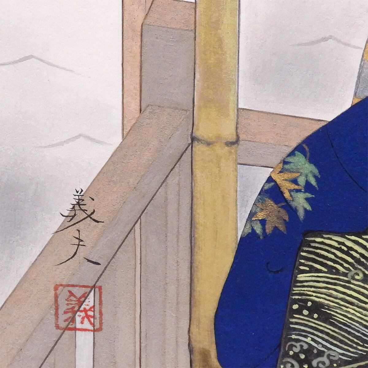 構図はきわめて安定的で、画面左の行灯と竹の支柱が縦軸を形づくり、右側の黒衣の女性が視線を受け止めることで、三人のあいだに静かな緊張を生み出している。