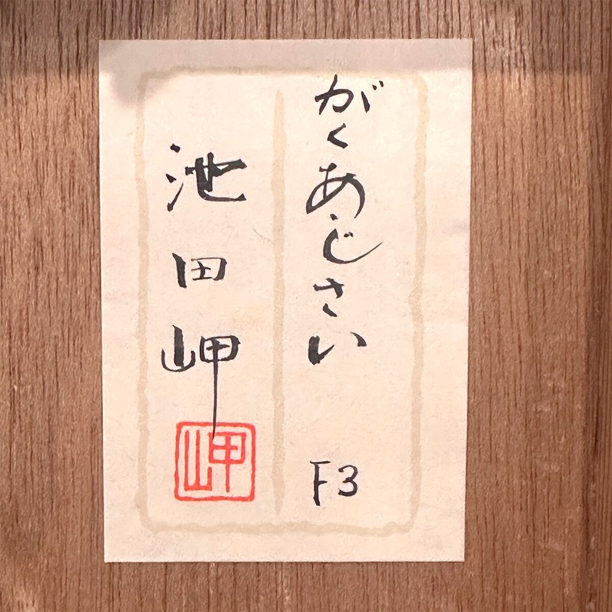 ■作品解説:池田岬の《がくあじさい》は、静かな涼しさを感じる日本画の作品。淡い紫の背景に、青紫の花がふわっと浮かび上がり、見るだけで落ち着くような雰囲気をつくっている。