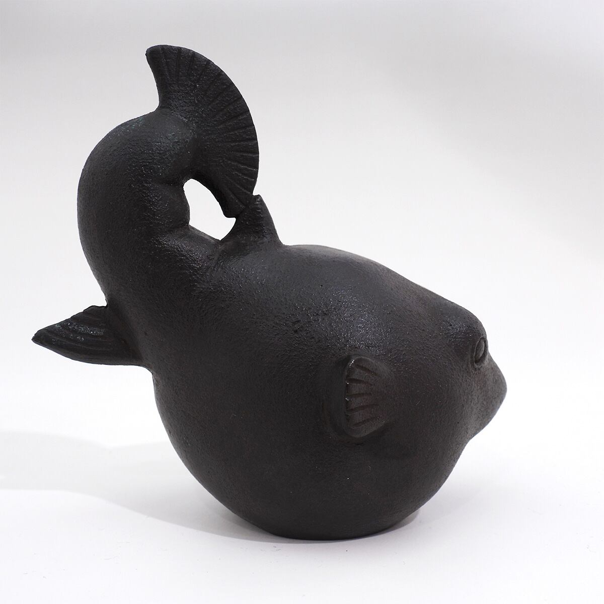 ■作品解説:丸い身体に、くるんと上を向いた尾びれ。思わず触れたくなるような、親しみのあるフグの姿をしたブロンズ作品「末広(すえひろ)」。