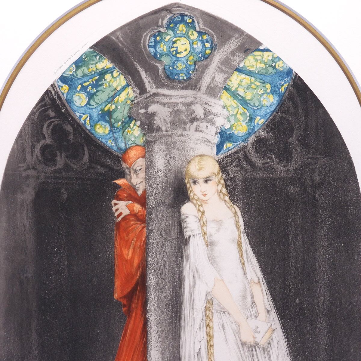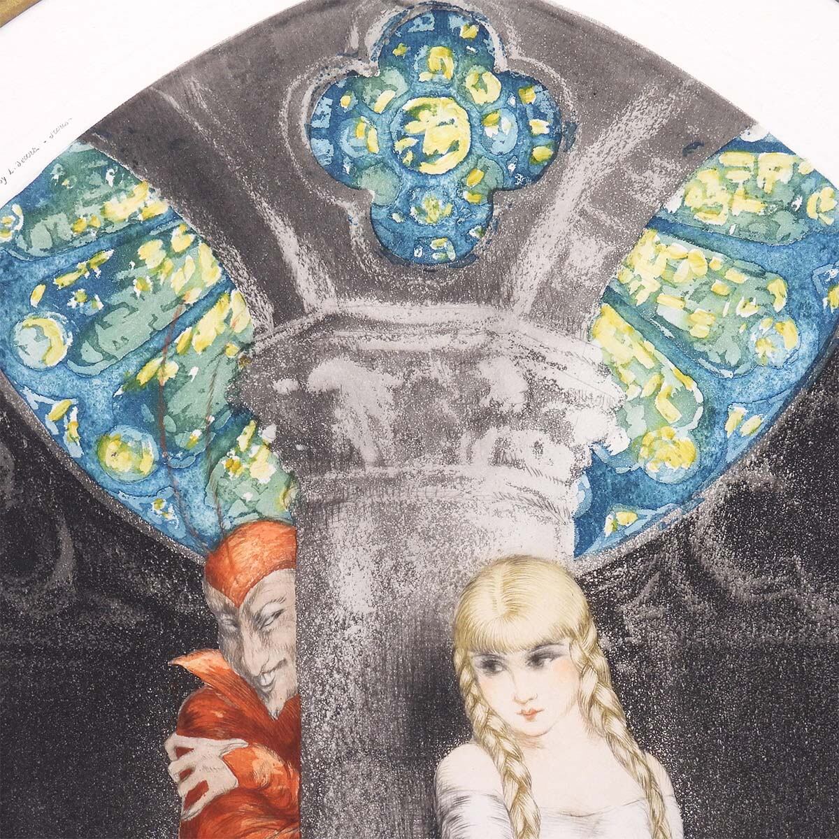 イカール特有の官能性は抑えられ、代わりに心理描写の緊張が際立つ。少女の白い衣は繊細なドライポイントと淡彩で清らかさを象徴し、対するファウストの赤は妖しさと欲望を濃密に滲ませる。背景上部に描かれたステンドグラスは、鮮烈な青と黄の対比により、神聖性と破滅の両義性を象徴する装置として機能している。