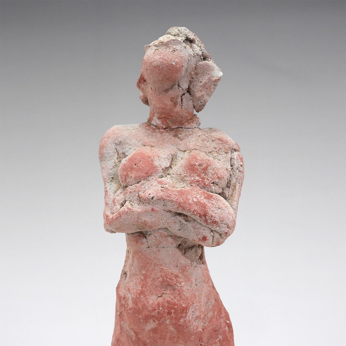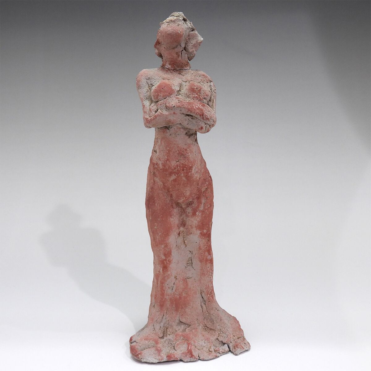 腕を組む閉じた身振りが、逆に胸郭の張りや腰の回転を強調し、静止と運動の二重性を生む。表面は土の粒子が光を吸い、陰影は彫りの深さではなくマチエールの厚みで立ち上がる。