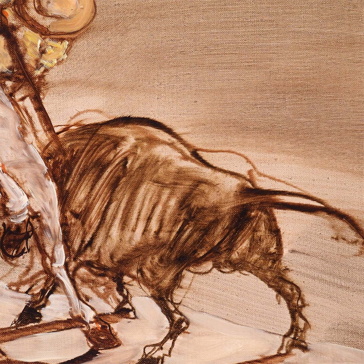 画面右の闘牛は量感を持つ濃褐色の塊として置かれ、対する馬体は白の刷毛跡で押し出される。