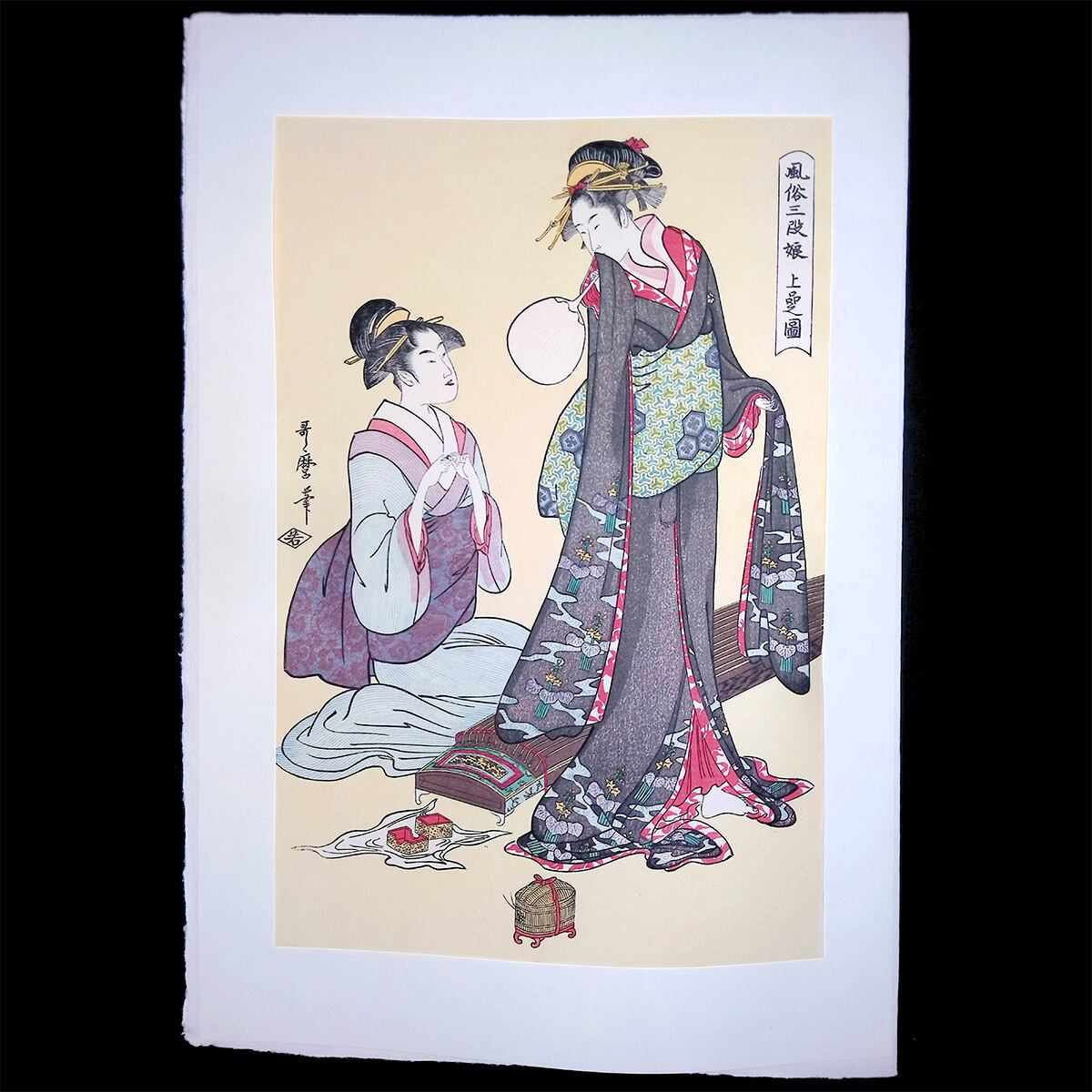 右の立つ女性は丸い団扇を手に、左手で長い袖を持ち上げる。向かいの座る女性は琴の撥を握り、二人の間には琴が横たわる。