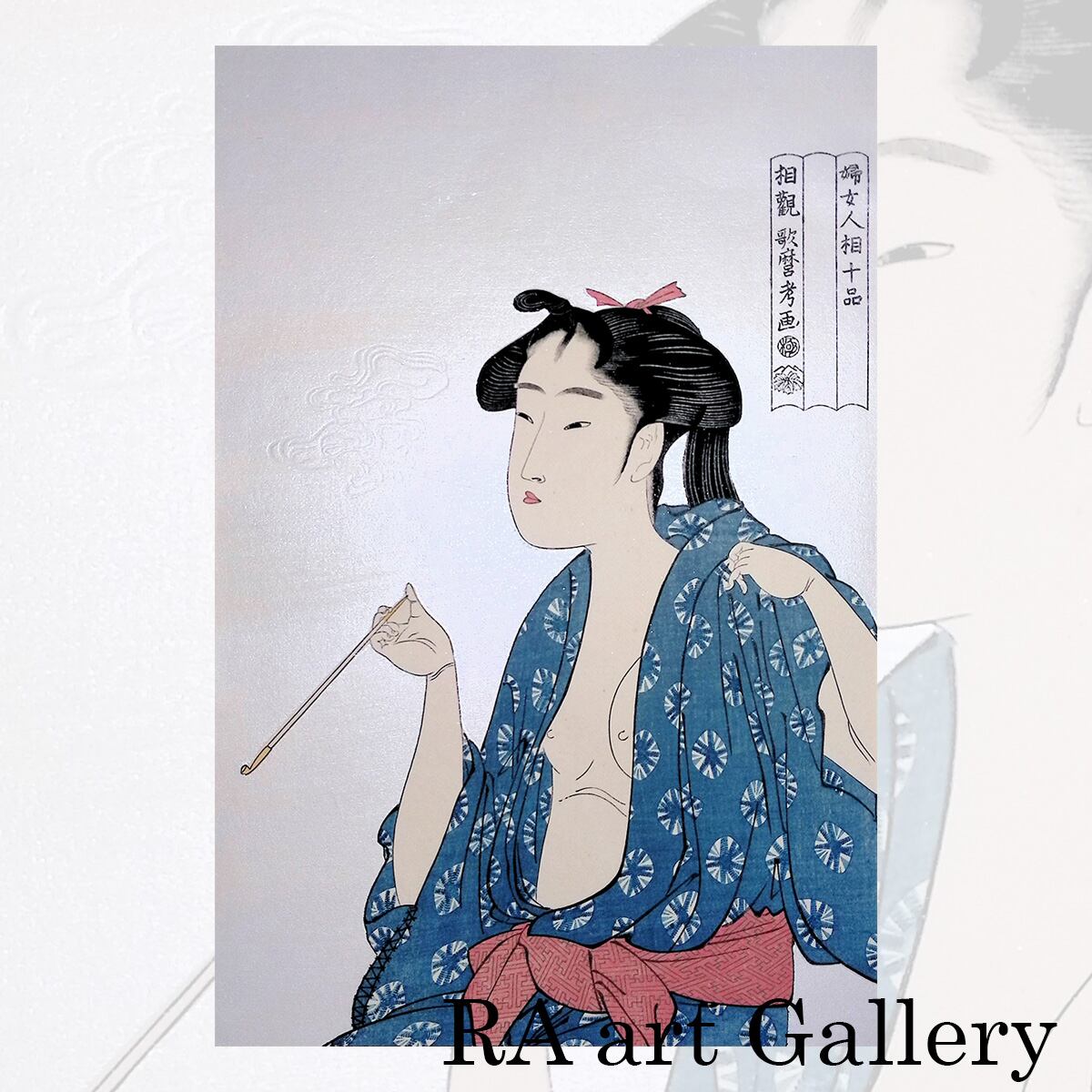 右上の画題枠に見える「相観 歌麿考画」という表記は、相貌を読む視線を前面に押し出す仕掛け。科学的分析というより、直感的な観察を見る側にも想像させる。