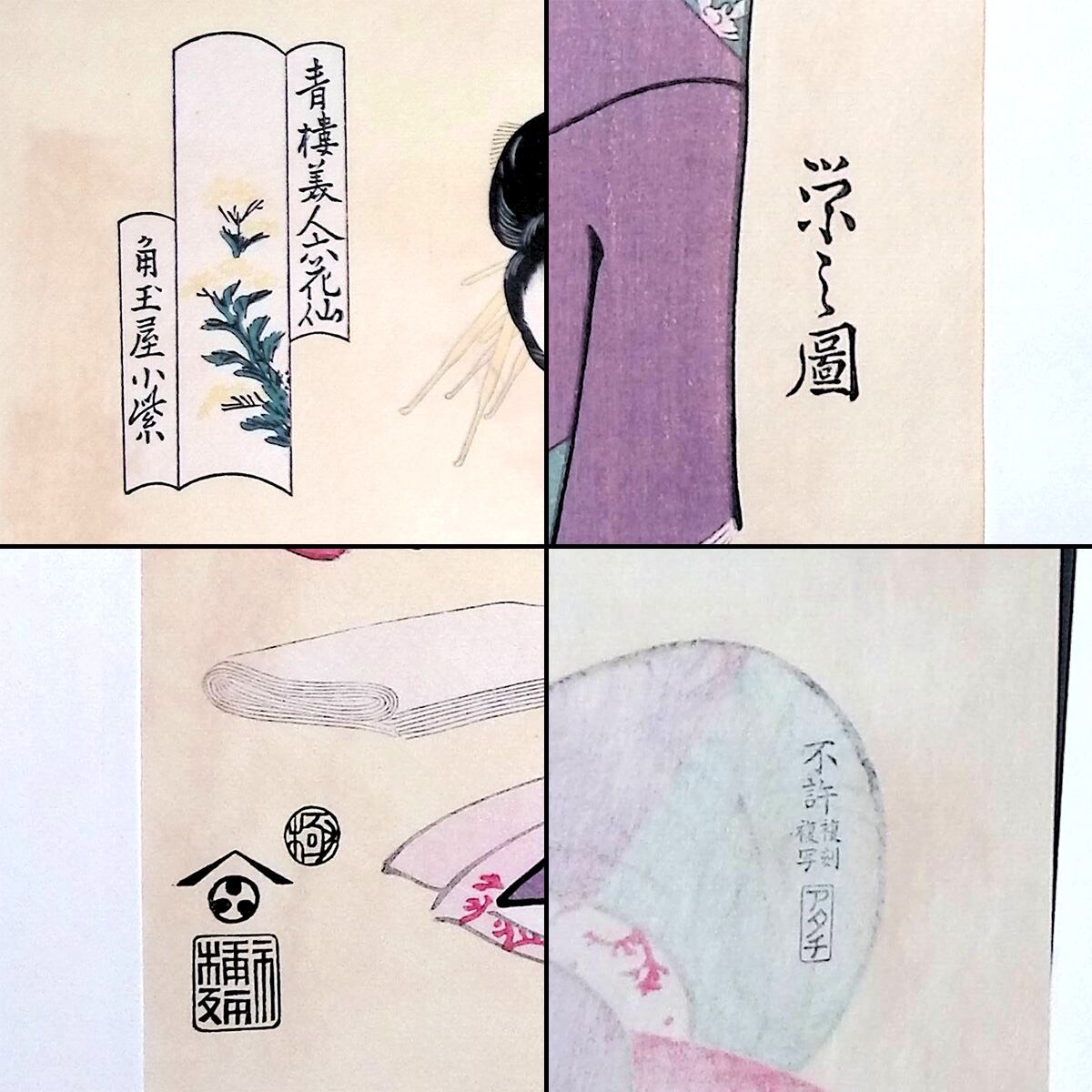 本作は、吉原の名妓を選ぶ揃物「青楼美人六花仙」の一図で、角玉屋の小紫を座像の半身で大判竪絵に据える。