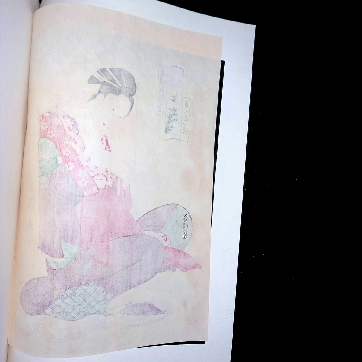 黄つぶしの地に題箋と草花の意匠を寄せ、手元の文へ視線を導く構成となる1790年代の代表作として伝わる。