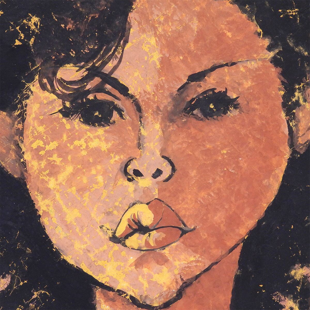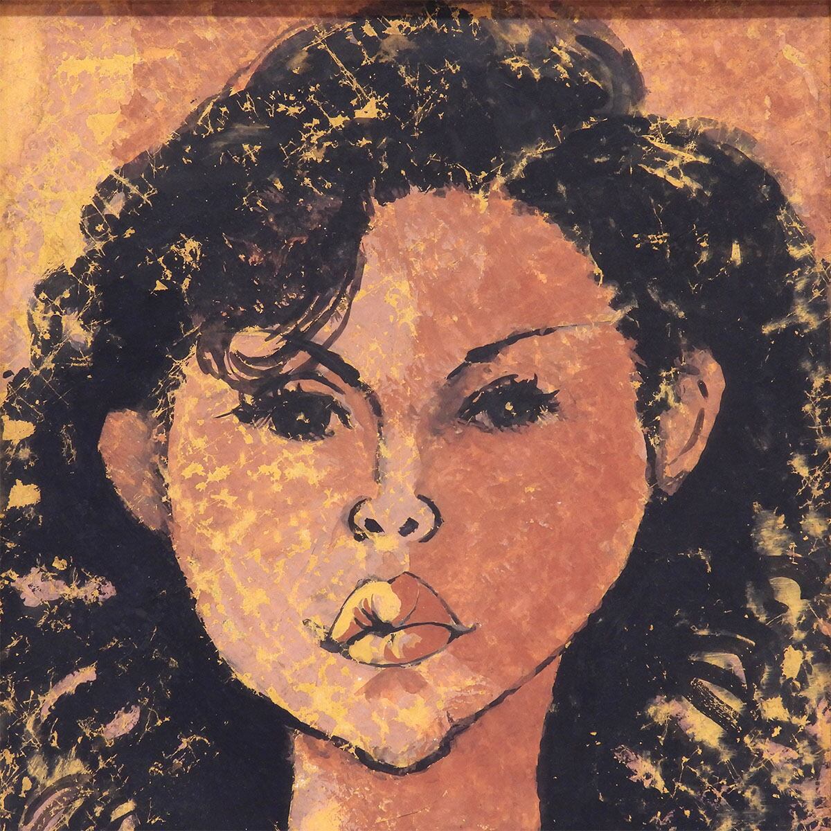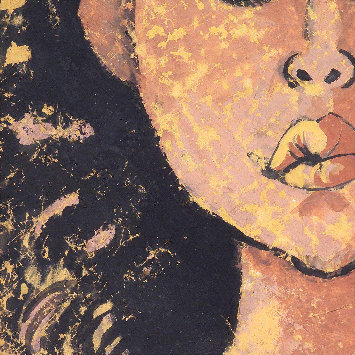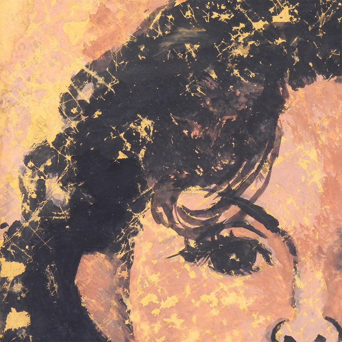 黒髪と背景に走る金の飛沫、頬に残る赤褐色の濃淡、輪郭線の断固たる強さ。グワッシュの不透明でマットな色面が “時間の層”を生成する。