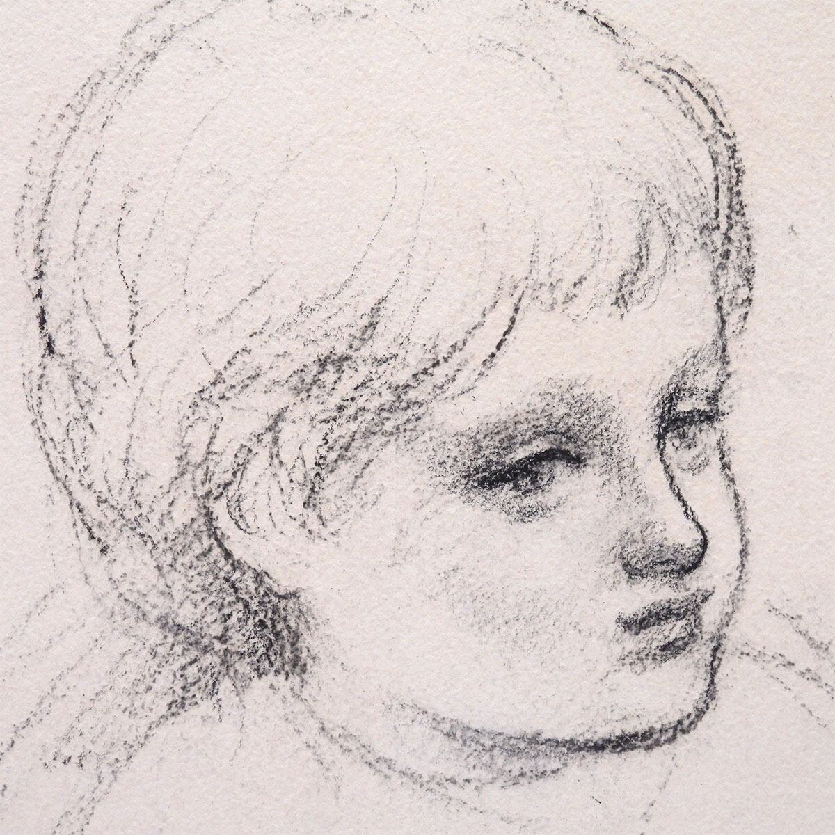 どこか天使の彫像のように感じる横顔は「線」ではなく、コンテの粒子を擦り、溜め、抜くことで、顔面の起伏を彫り起こした「影」で構成されており、コンテでありながら、彫刻作品のようにも見える舟越のエッセンスが凝縮された良品。