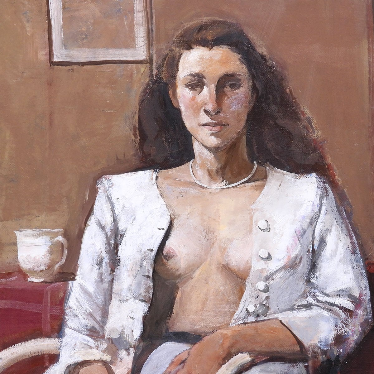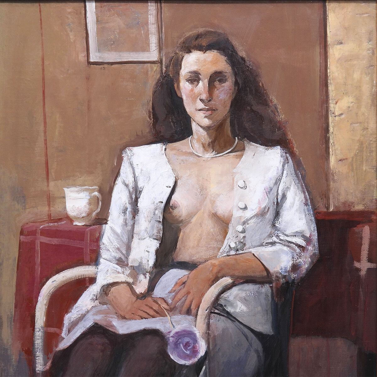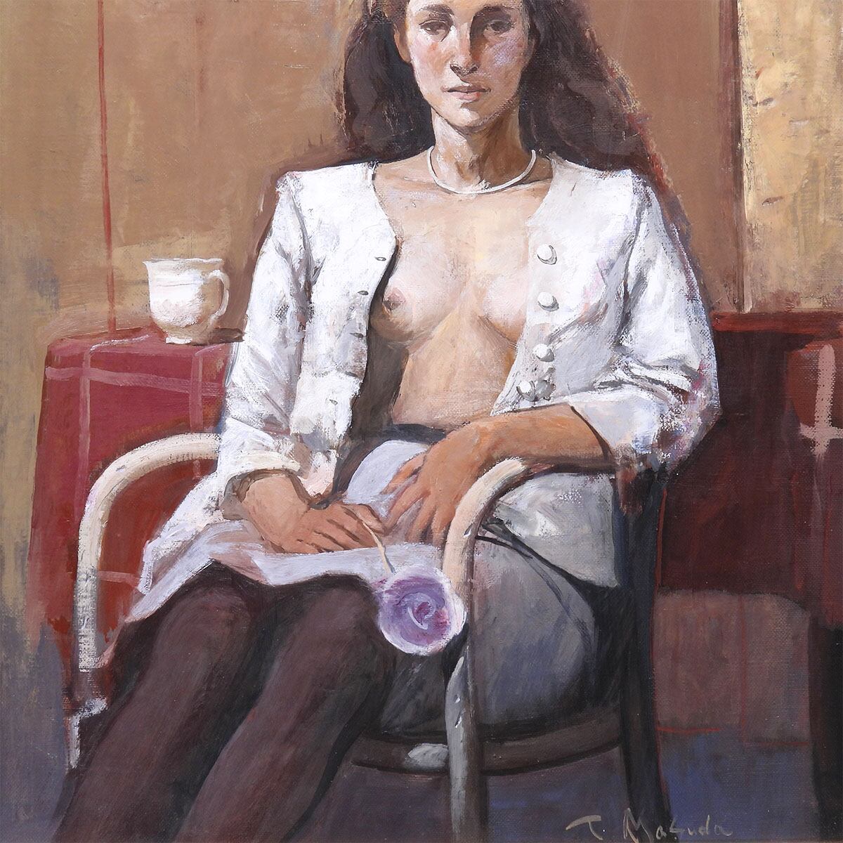 白い上着を羽織り、室内には赤いテーブルと白いカップ、窓枠の四角が置かれている。ポーズは静かで、表情も落ち着いている。