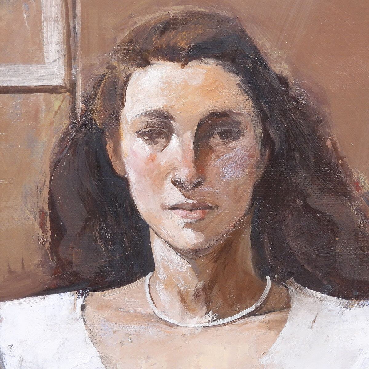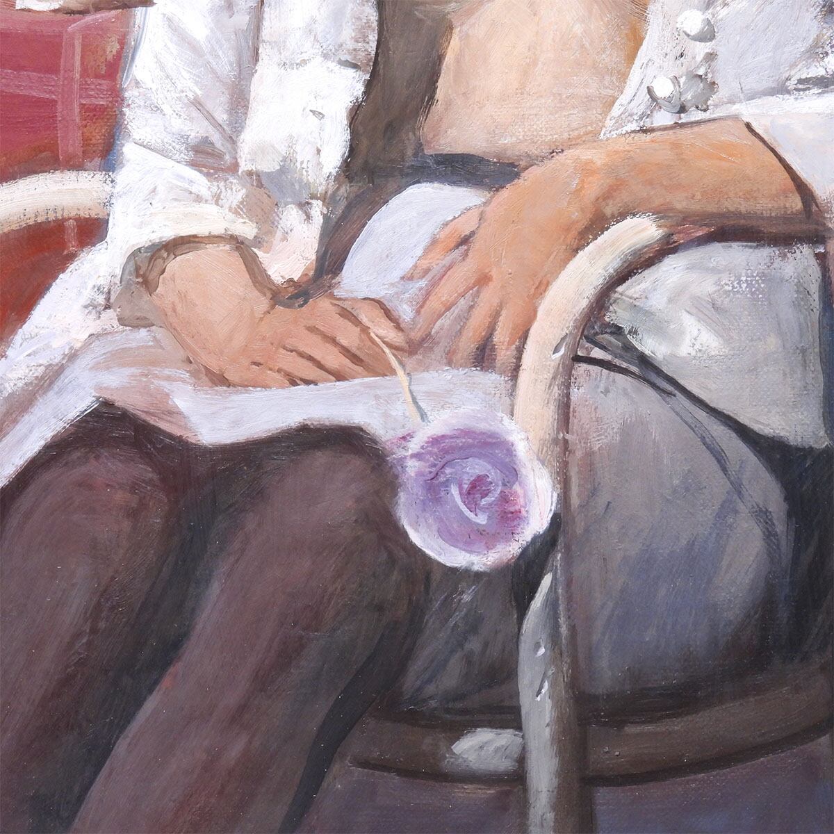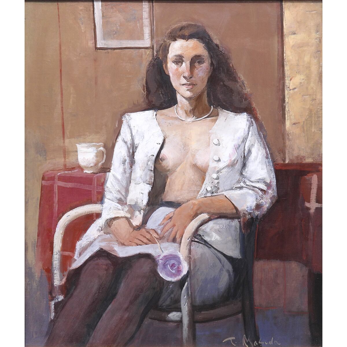 白い上着を羽織り、室内には赤いテーブルと白いカップ、窓枠の四角が置かれている。ポーズは静かで、表情も落ち着いている。