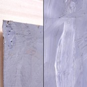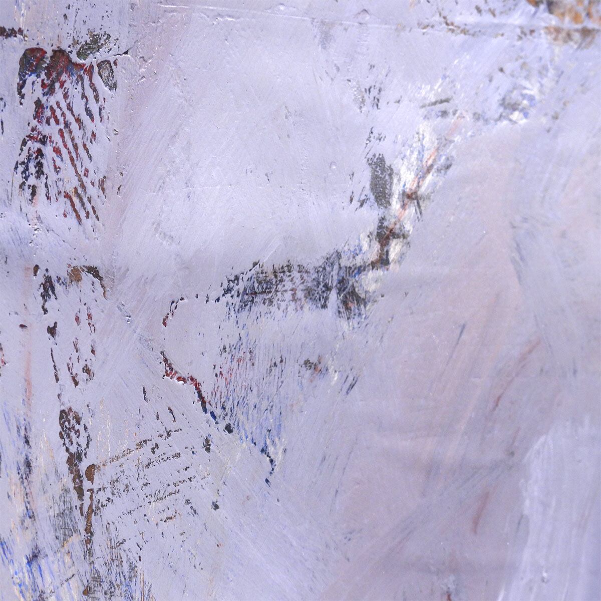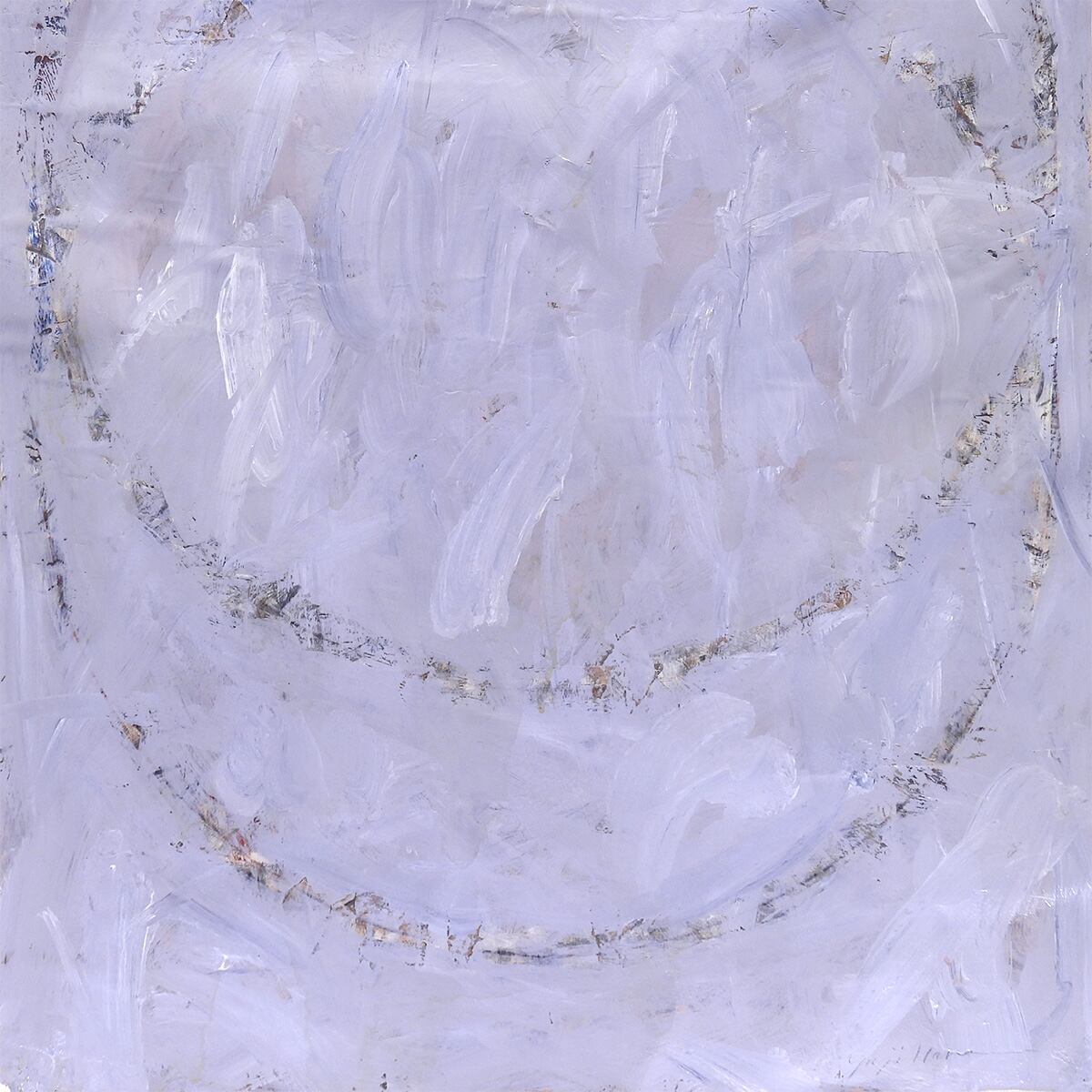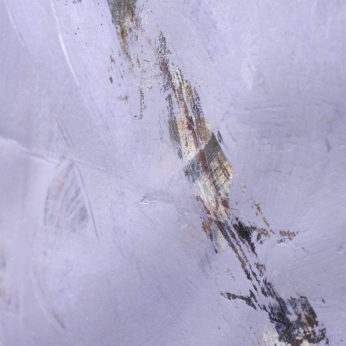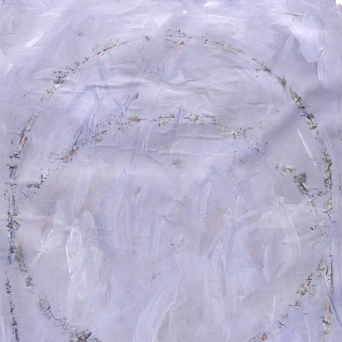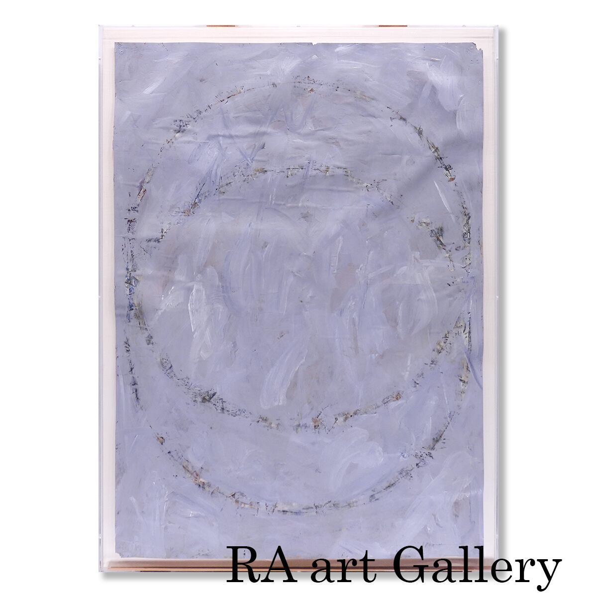 ■作品解説:淡い藤色の空気に、二重の輪がふっと現れる。近づくと、白い筆跡が何層も重なり、ところどころに錆びたような色が残る。
