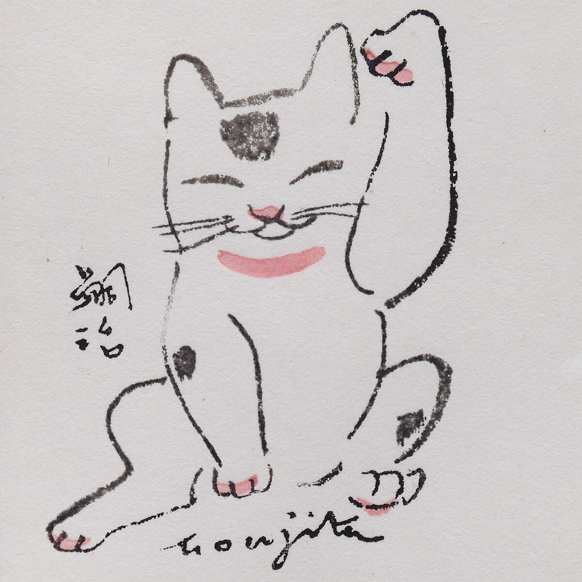 片手を上げたポーズ、黒い斑点、口元の朱が、少ない線と色で気持ちよく整い、見れば見るほど愛嬌が増す。