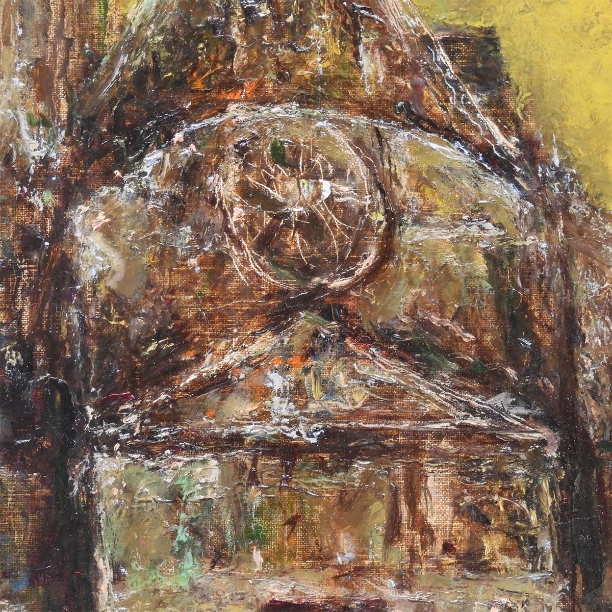 茶・緑・黒が絡む塊が、空気の黄色に押し出されて前へ出てくる。