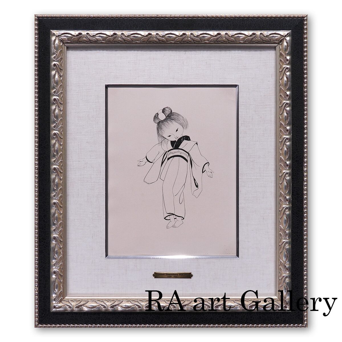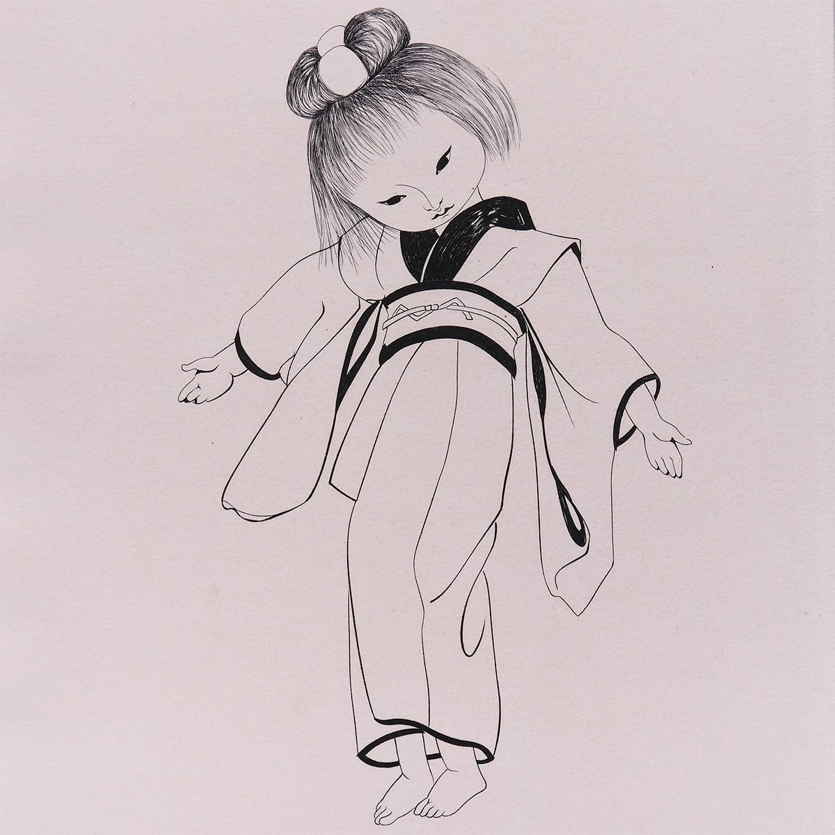 本作は、着物の少女がふわりと傾き、両手をひらいて立つ姿。