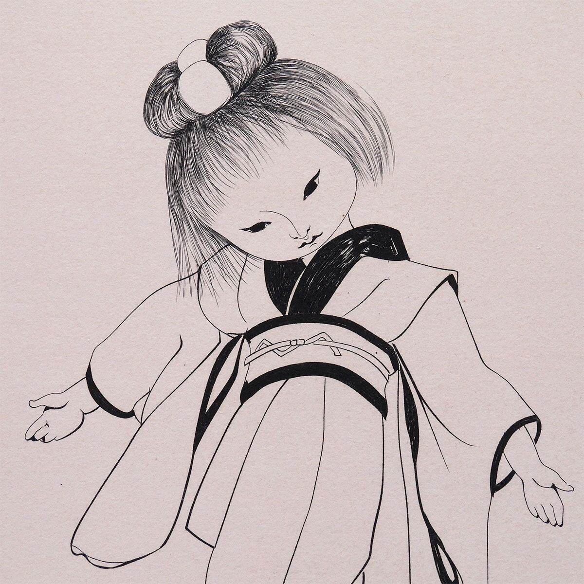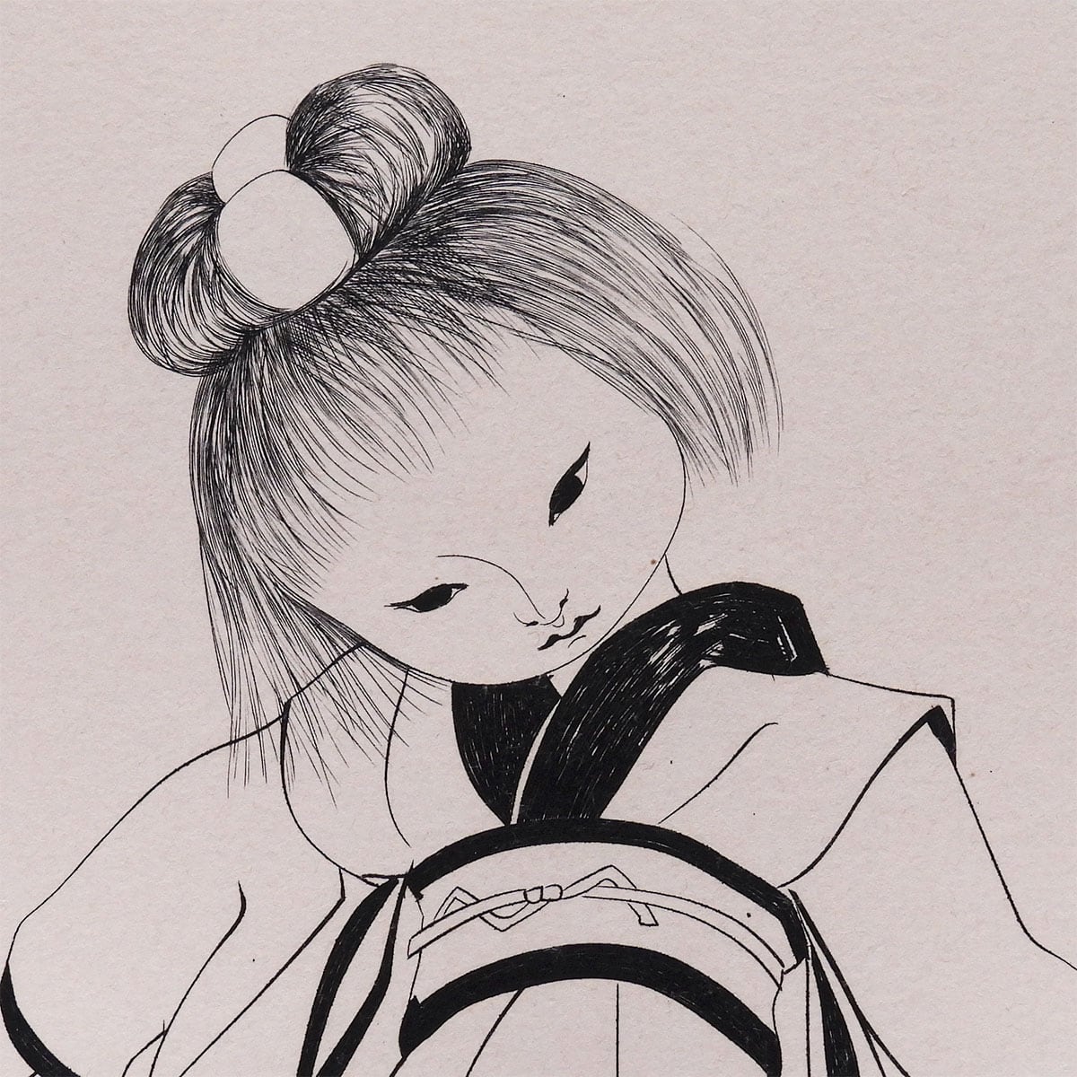 黒い線だけで、髪のつや、襟の重み、幼い頬の丸みまで立ち上がる。