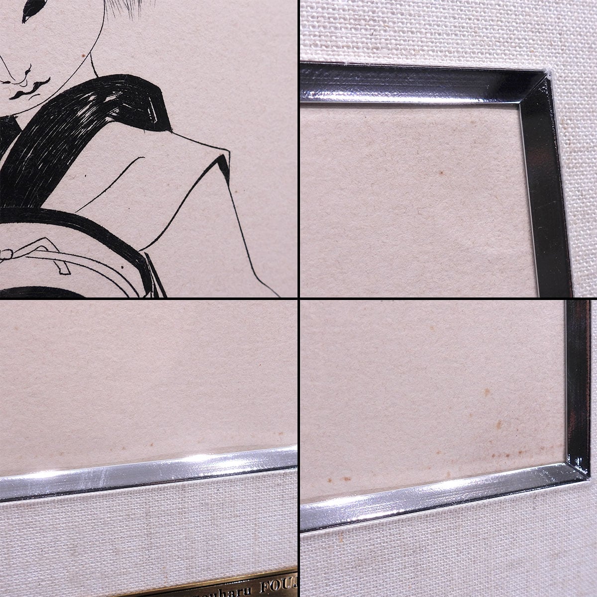 藤田の輪郭線は、彫りの深浅と線の方向で密度が制御され、黒い襟や帯は面として締まり、頬や袖は空気を含んだまま残る。