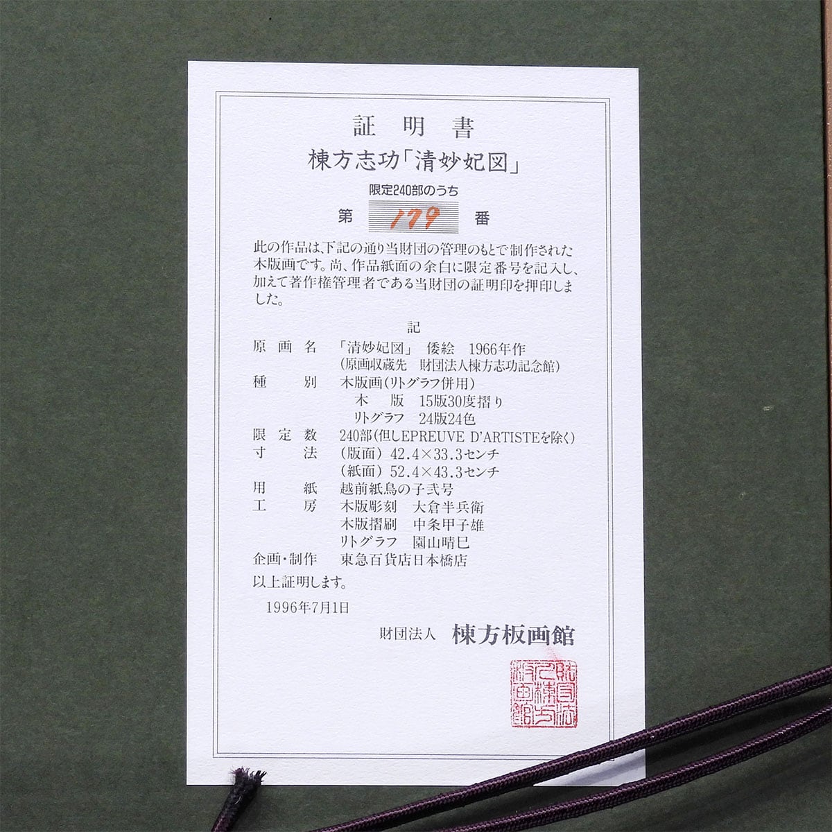 本作品は、東急百貨店が企画、財団法人棟方板画館が監修し1996年に作られた正規品の版画。