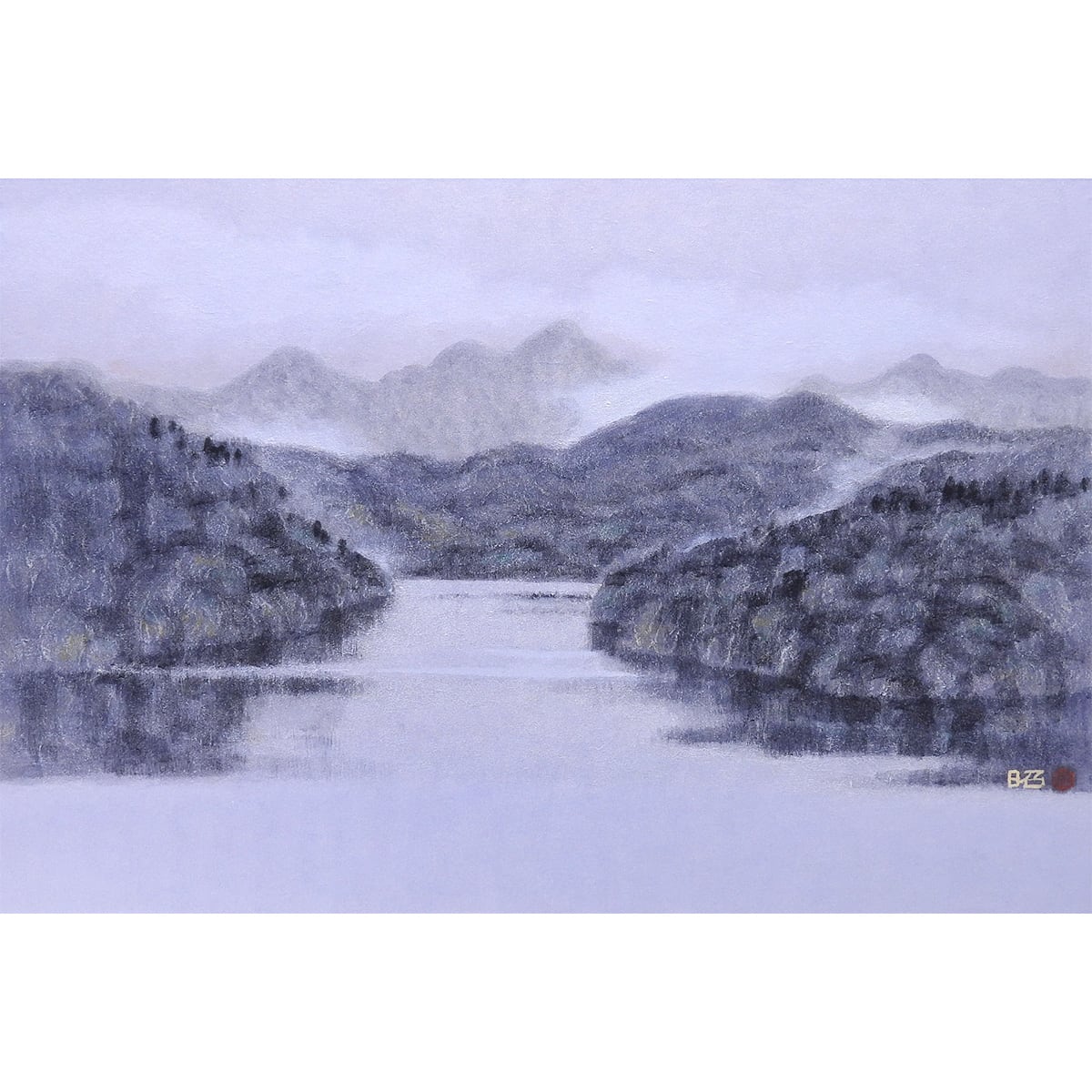 作品は、仏教用語でいう無常が漂う作品が多く、見る者の心を落ち着けてくれる山湖を描いた作品が多い。