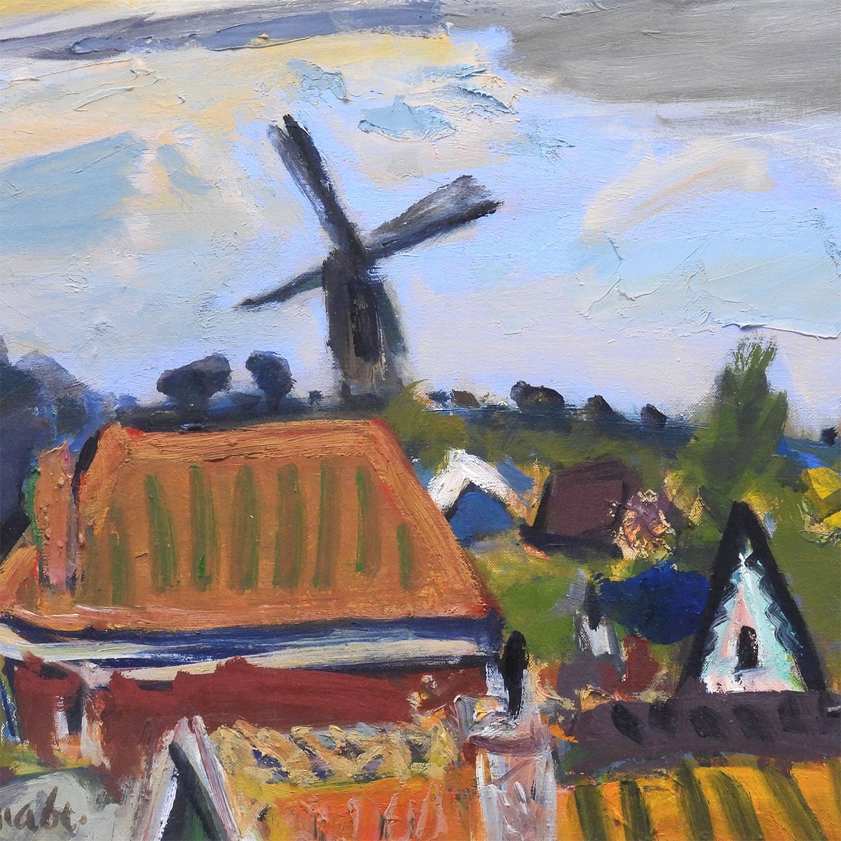 手前の屋根は厚いストロークで面を立て、遠景は緑と青で軽やかにまとめ、黒い風車が画面の合図になる。