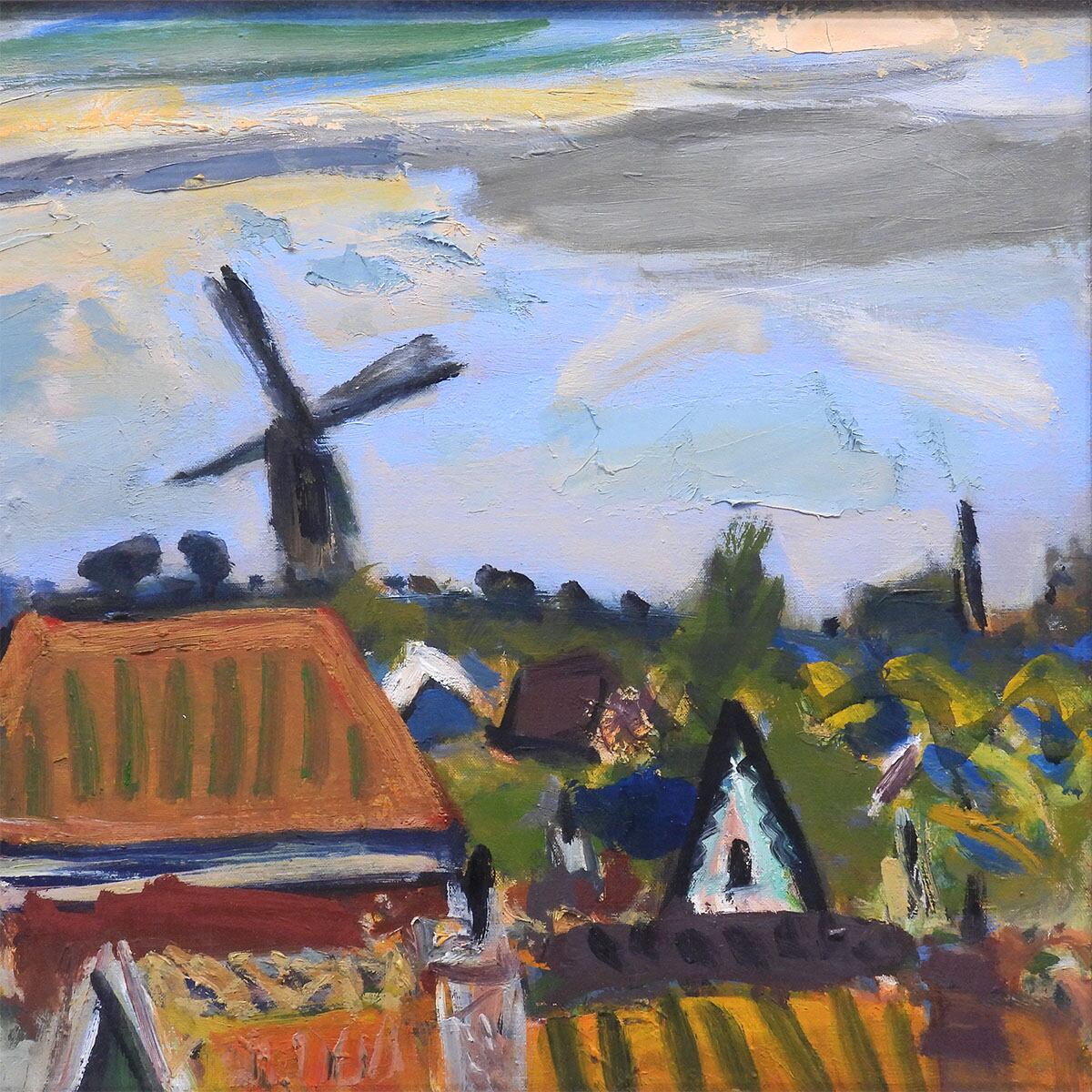 空の色面と赤茶の屋根のあたたかさで、オランダの風と距離が伝わってくる作品。