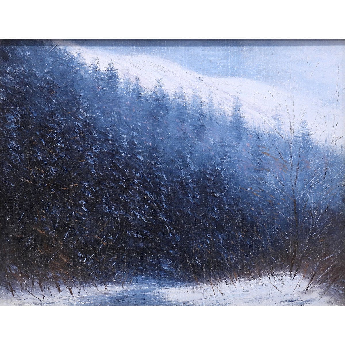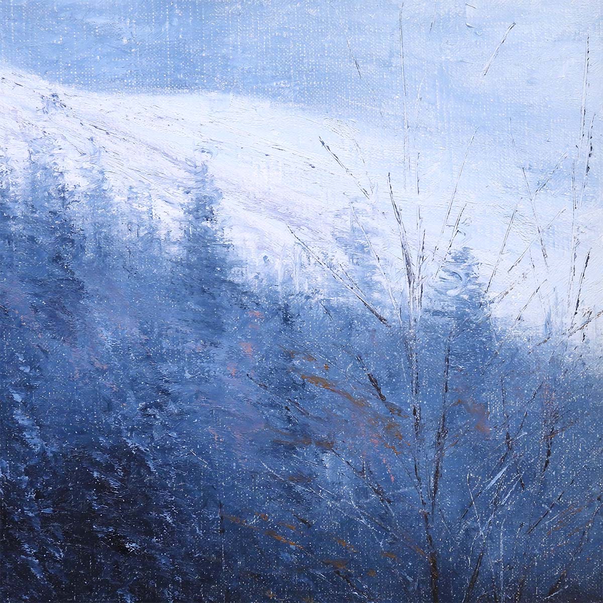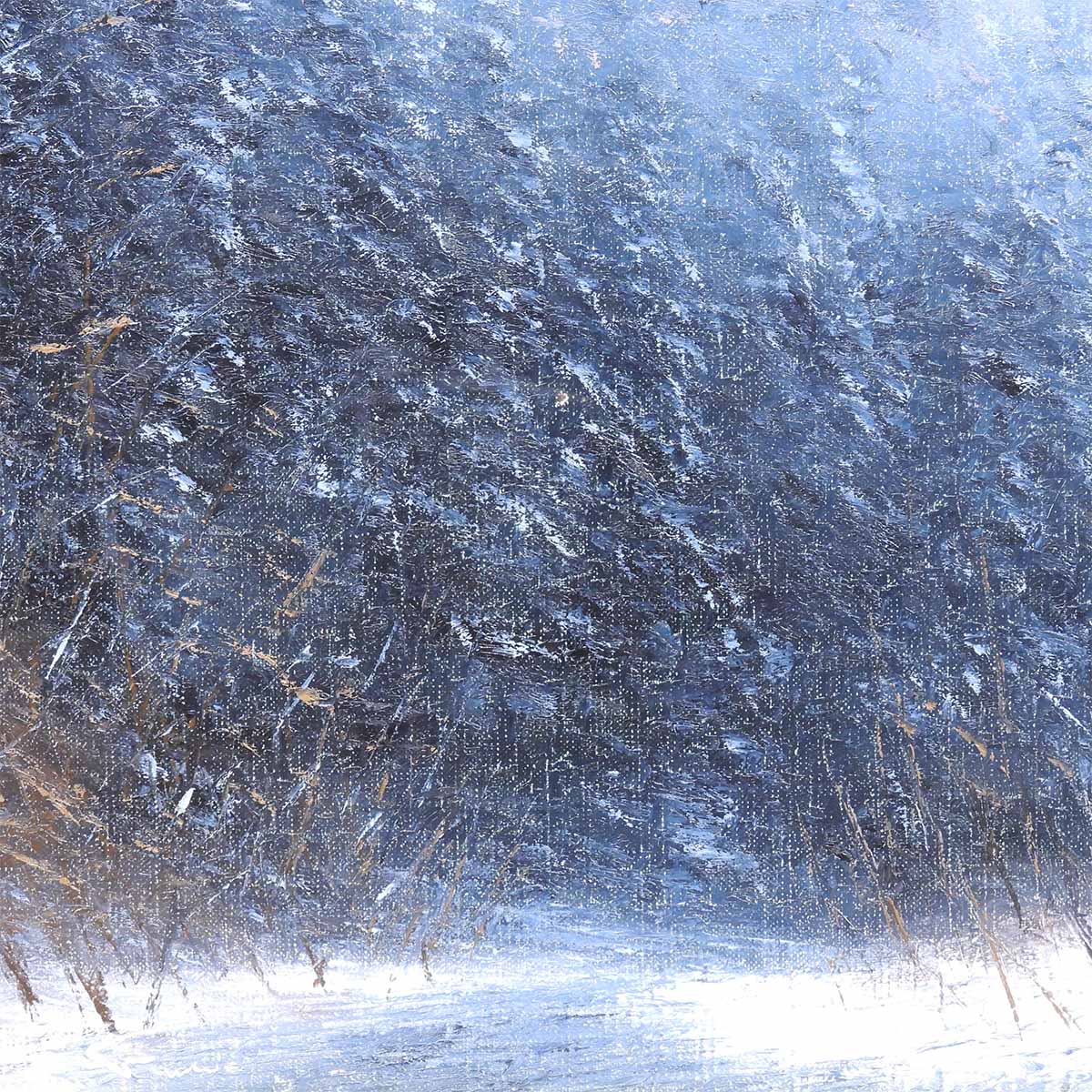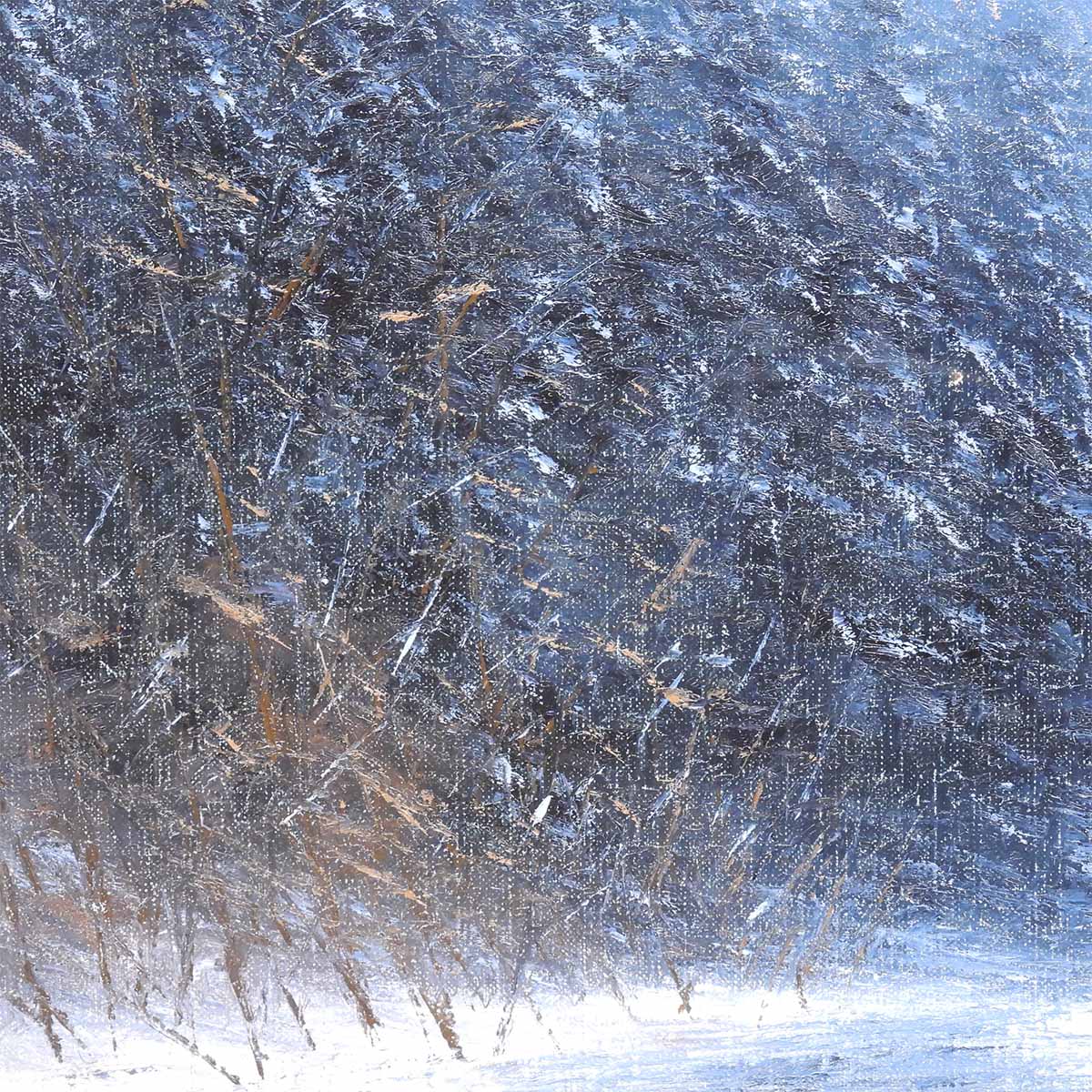 画面の手前には、踏みしめた雪の白さ。左には濃い藍の茂みが壁のように立ち、右には細い枝が凍えるように伸びている。遠景は靄(もや)に包まれ、山の斜面が淡く光る。