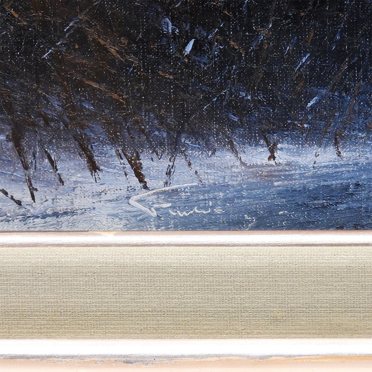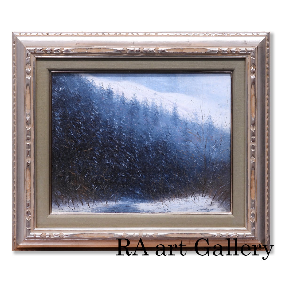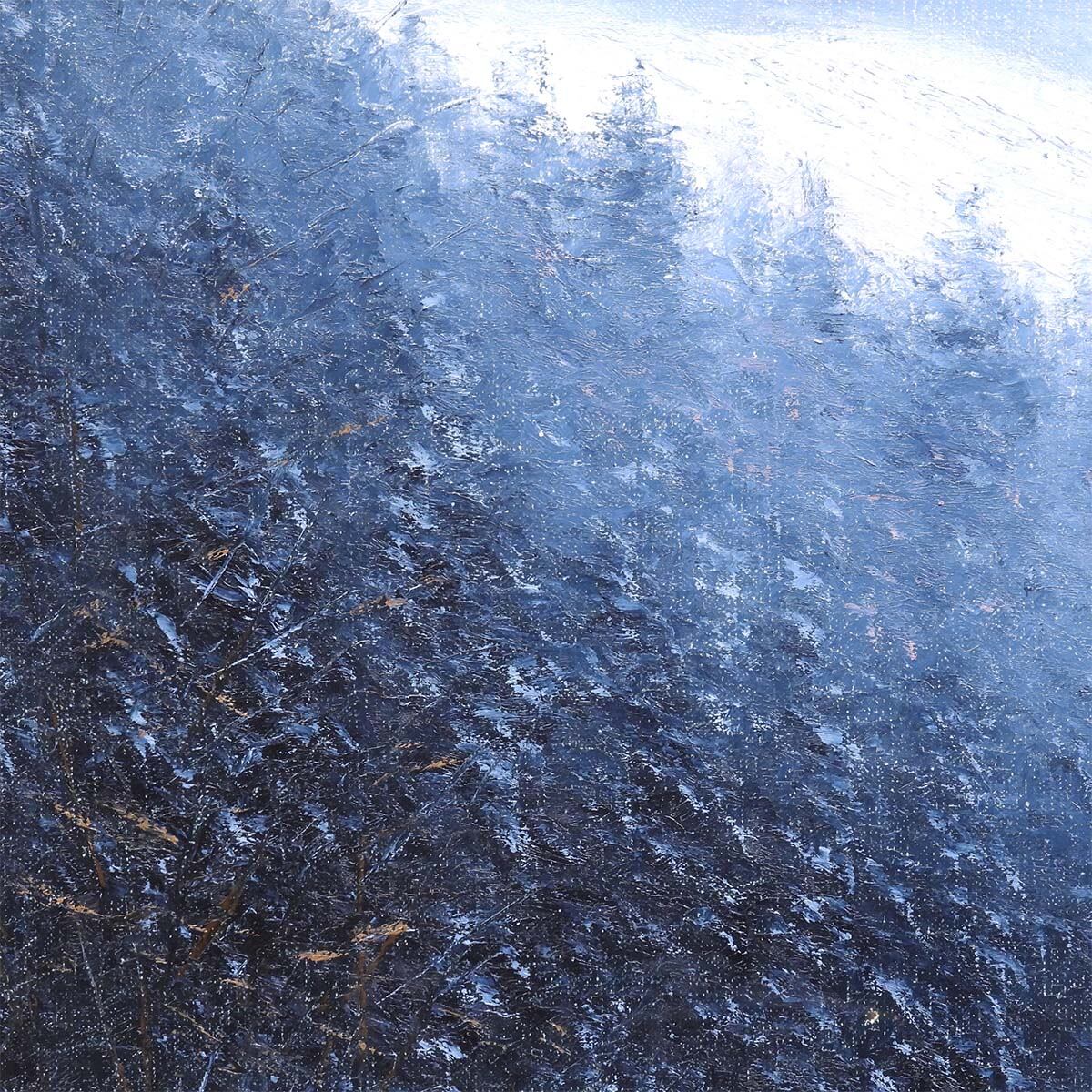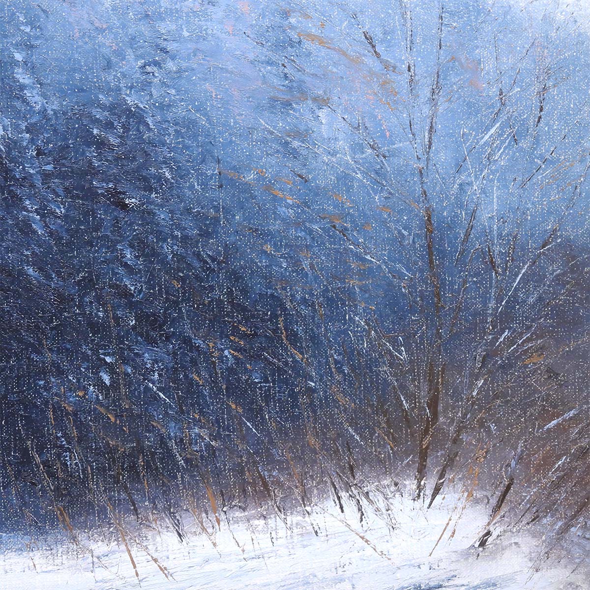 画面の手前には、踏みしめた雪の白さ。左には濃い藍の茂みが壁のように立ち、右には細い枝が凍えるように伸びている。遠景は靄(もや)に包まれ、山の斜面が淡く光る。