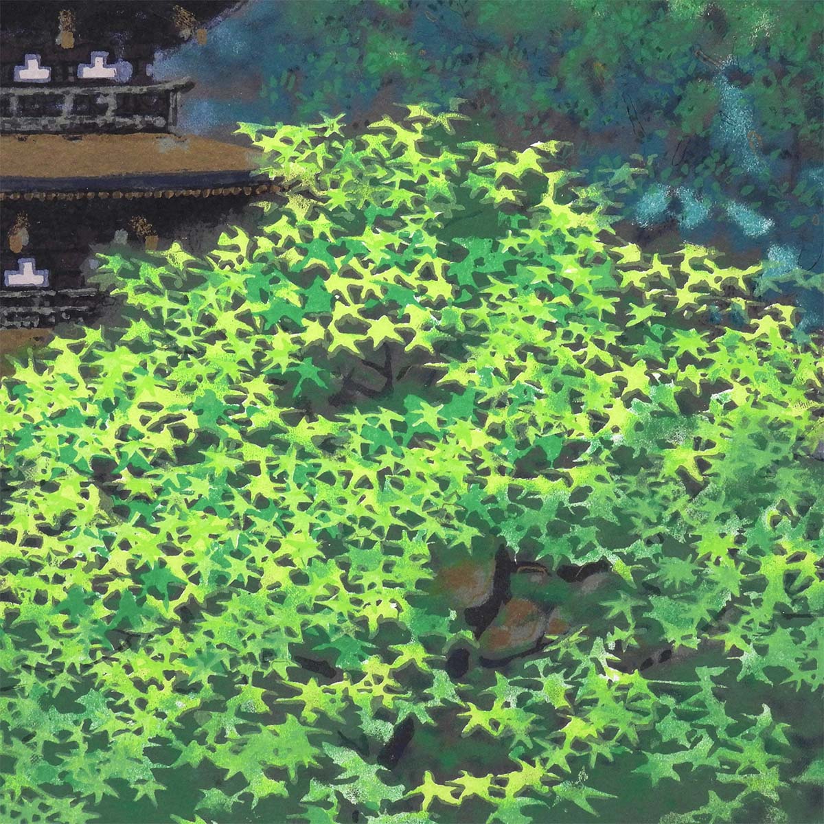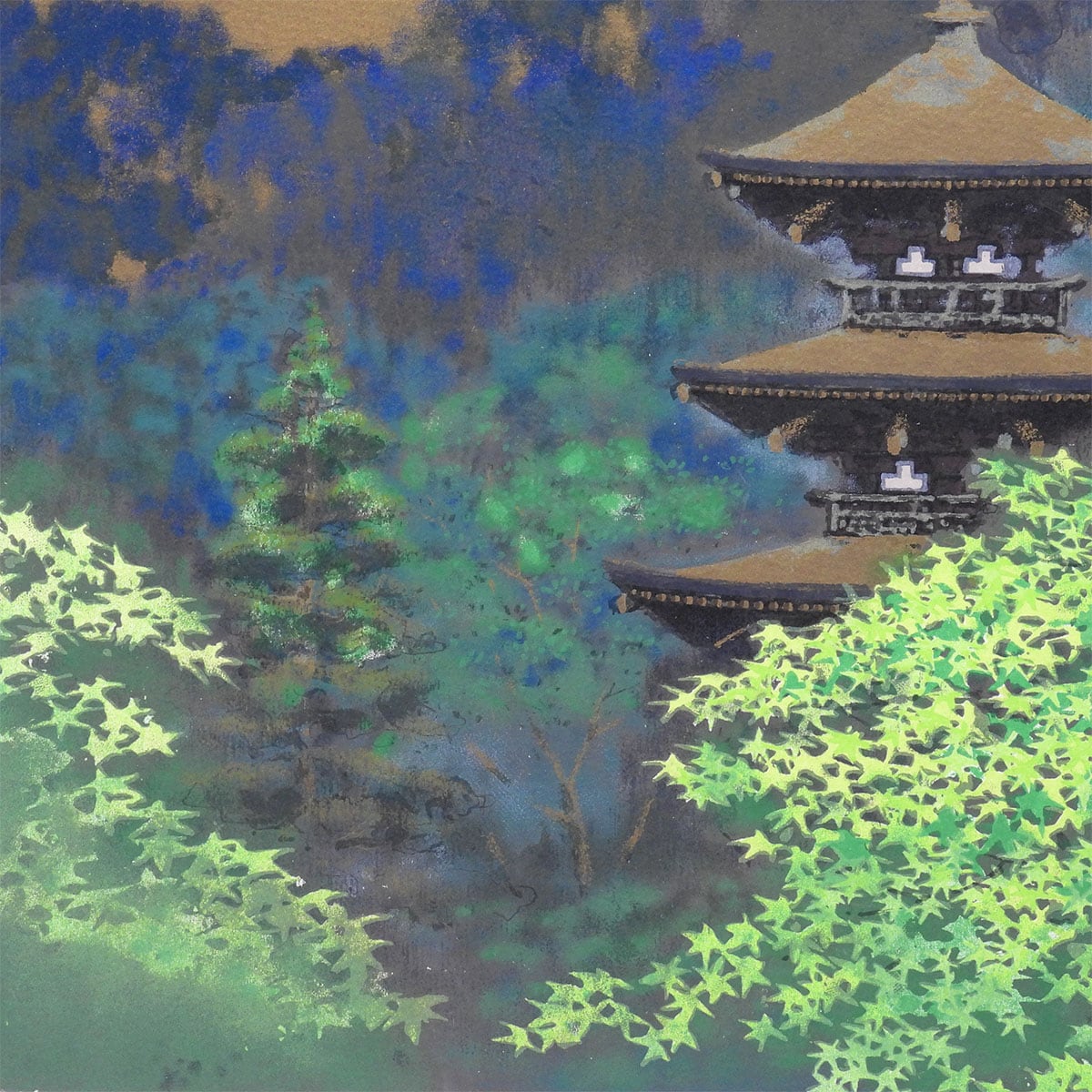 深い森の青と、手前の青もみじの明るい緑がぶつかり合い、塔が静かに浮かび上がる一枚。