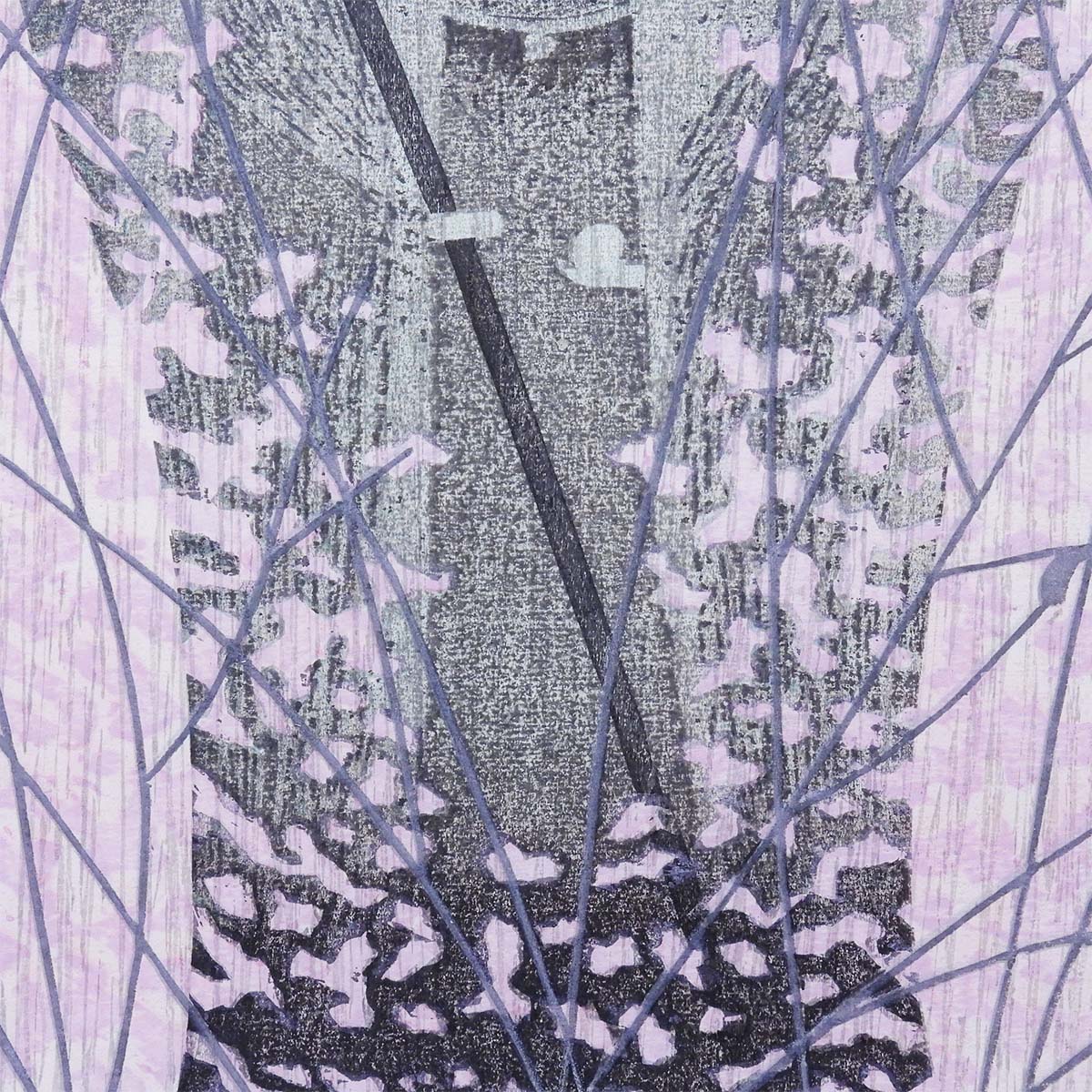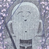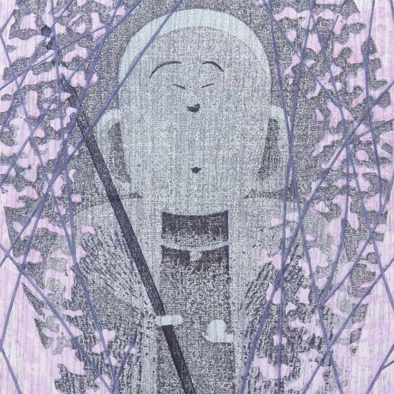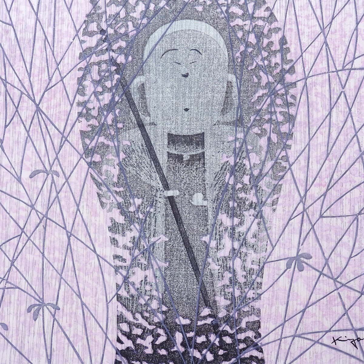 鮮やかなピンクのかすみ草の中に地蔵を配した作品として言及。ピンクは装飾ではなく、微粒子の層として画面全体に漂い、タイトルの「かすみ」を視覚化している。