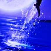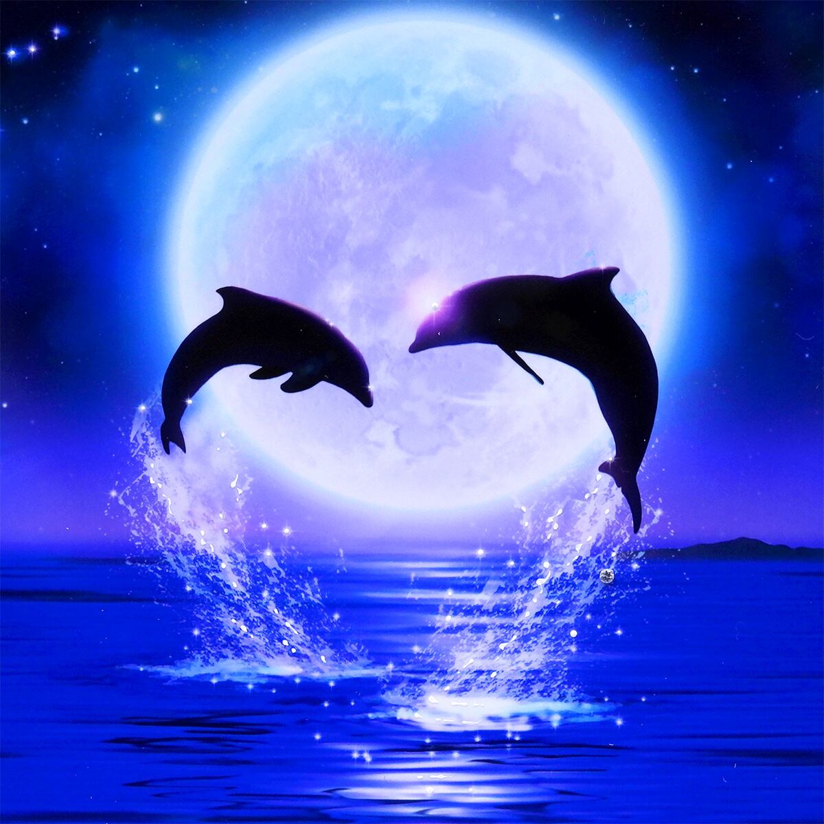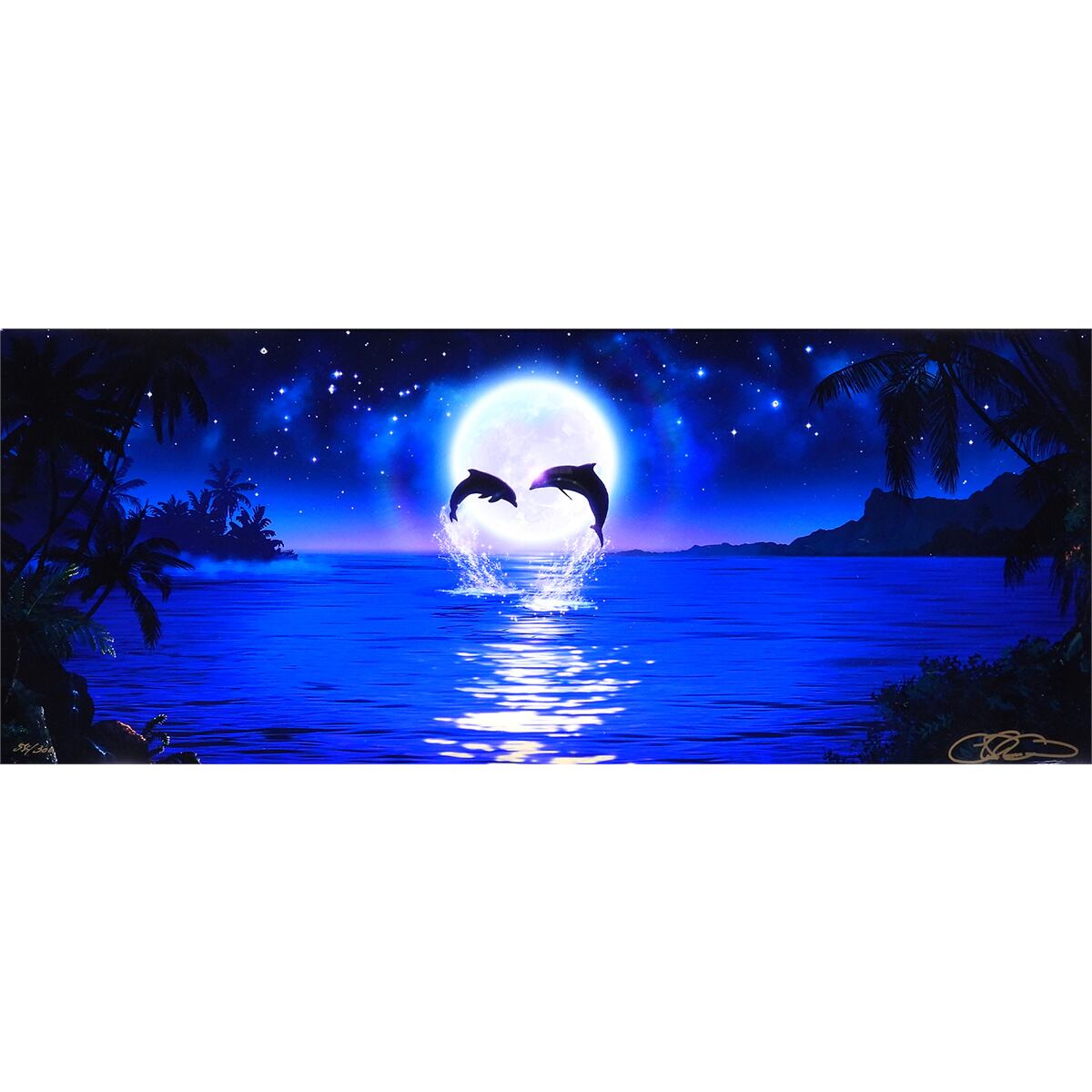 本作は、満月の前で二頭のイルカが同時に跳ねる情景。しぶきが弧を描き、ハートの輪郭にも見える。