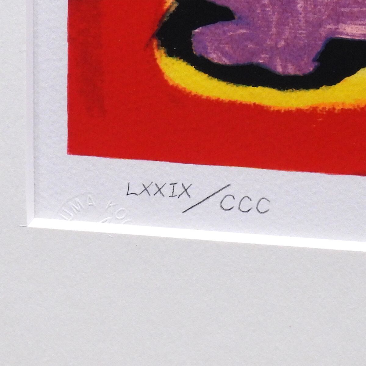 本作品は、岡本太郎の復刻版画作品。自分の職業を「人間」と言う岡本太郎。「哄笑」は、口を大きく開けて笑う意味だが、まさに「人間」を表現した作品となっている。作品の中には様々な体の部位が隠されている。是非探してみてもらいたい。